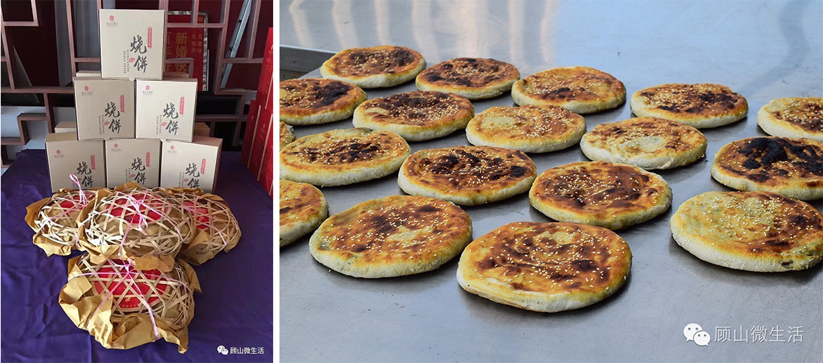 此两种习俗饮食,传说南朝梁代的昭明太子萧统,在顾山帮助开渠引水时,老百姓曾用此饼招待他,昭明太子食后称好吃,从此成了顾山烧饼,两千年传承,一般在新春佳节食用,或作点心礼品馈赠